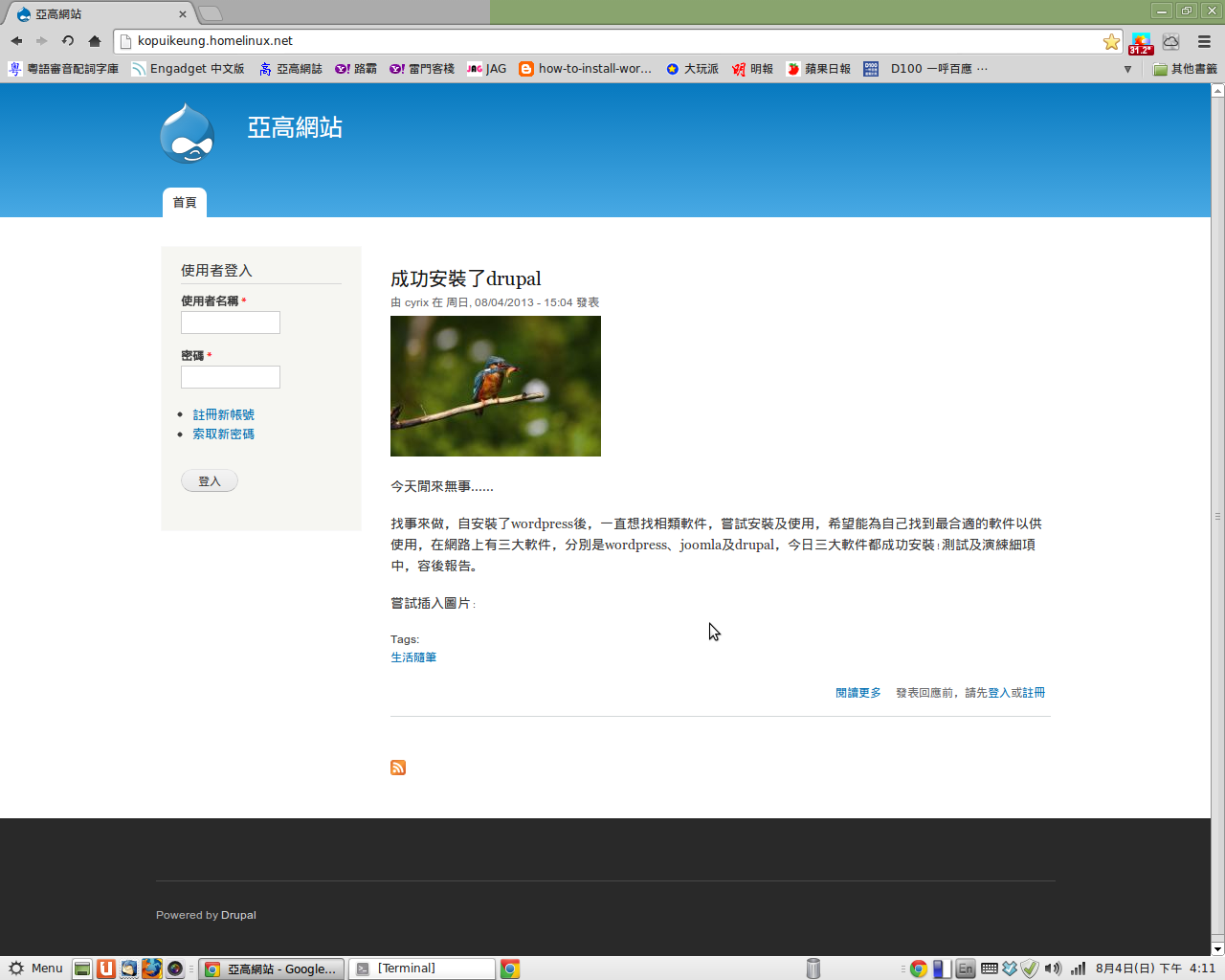 初步感覺還可以,但我覺得用Linux架Wordpress網站,可能更加有效率,但213j勝在體型小,操作十分靜,維護比PC容易。言歸正傳,我新網站的URL是http://kopuikeung.homelinux.net。有興趣歡迎入內參觀﹗