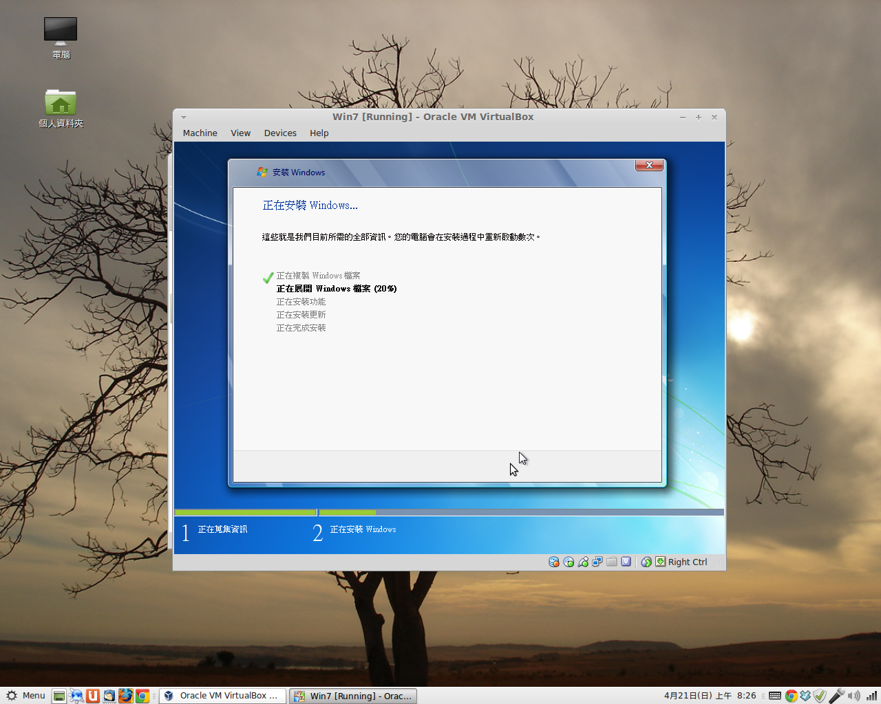 利用虛擬機器演練Linux,我反其道而行,在Linux的虛擬機器中運行Windows 7,裝好後感覺十分順暢,在視窗7中選擇安裝了LibreOffice來取代視窗的辦公室軟件,用Thunderbird作為郵件的預設軟件,一切完美﹗