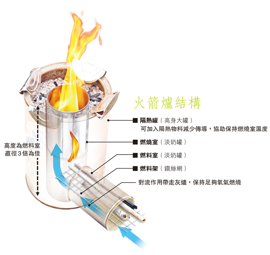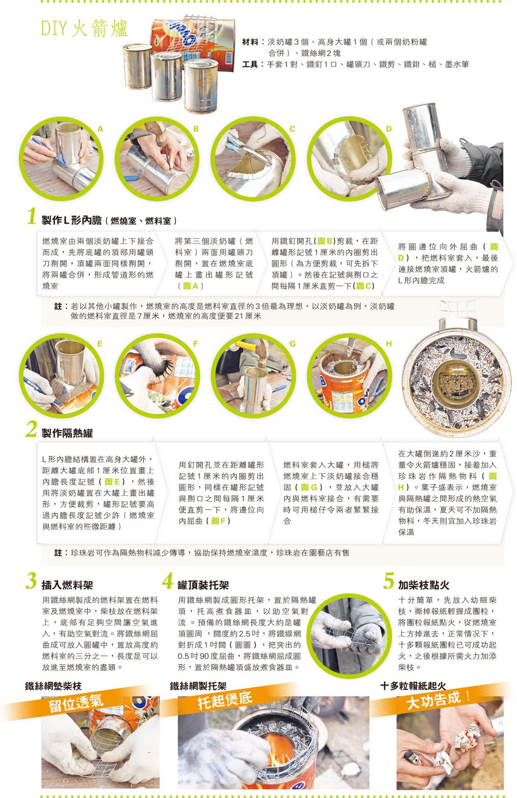 製作「火箭爐」只需數個廢鐵罐,透過簡單的剪裁及接合,不消20分鐘搞定,放入數根幼小柴枝,已經火力超強而且沒有濃煙。在郊野可作為煑食爐具。如你家中有小花園、天台或露台就可放一個,閒時用來煲咖啡,甚至和三五知己歎火鍋,過程滿有趣味又環保。
